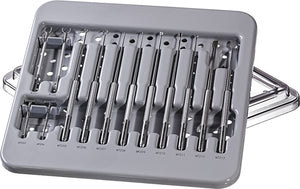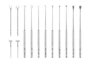 Custom surgical instruments facilitate locating, designing, and creating the window and inserting the implant. Available as a complete 13-piece set with sterilisation tray.